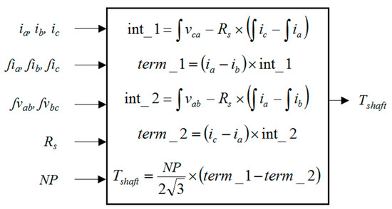 In the case of a Y-connected motor without a neutral connection or a delta-connected motor, . Thus, Equation (7) can be rewritten to use only two-line voltages and two-line currents, reducing the number of required input data to calculate the air-gap torque.