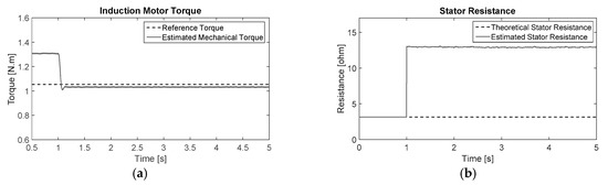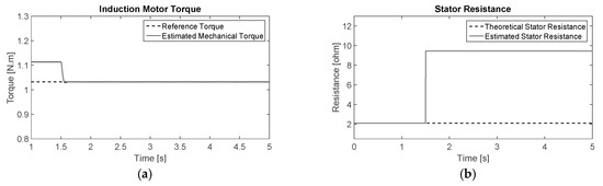 Finally, it is important to emphasize that the “physical” stator resistance is dependent on the thermal effect. However, the proposed modified stator resistance is not simply the physical stator resistance; it is a mathematical artifice or a “fictitious” stator resistance that comprises the mechanical losses effect. As it is only a mathematical artifice, the thermal effect is not considered. This, indeed, can be considered as an advantage of the proposed method.