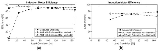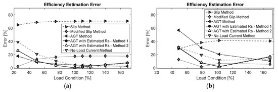 In the case of simulation results (Figure 16a), the proposed methodology (AGT with Estimated Rs—Method 1 and Method 2) and AGT method presented the smallest errors. The errors obtained by these methods were less than 8% for load conditions above 75%. In addition, the proposed methodology conducted to the smallest error for load conditions between 75 and 110%. The errors obtained by using the proposed methodology were small for the different load conditions from 50% and so on. The no-load current method presented small errors from load conditions above 75%. The modified slip method and mainly the slip method presented the biggest errors. In the case of experimental results (Figure 16b), the proposed methodology (AGT with Estimated Rs—Method 1 and Method 2) and modified slip method presented the smallest errors. The errors obtained by these two methods were less than 10% for load conditions between 80% and 140%. In addition, the proposed methodology presented the smallest error for load conditions near 100%. The errors obtained by using the proposed methodology were small for the load conditions near 80% and 100%. The results show the effectiveness of the proposed methodology for in-service IMs efficiency estimation.