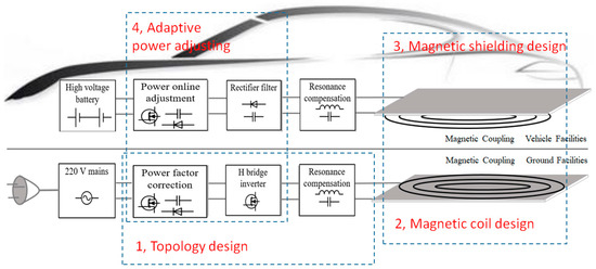 Due to the fossil energy crisis and greenhouse gas limitations, electric vehicles including pure electric or hybrid power vehicles, have been promoted in recent years. The battery is commonly known as one of the most important components in an electric vehicle. Fuel cell and lithium-ion batteries are the most commonly used power sources in electric vehicles. Each type of battery has its own idiosyncrasy. For example, fuel cell systems [1], which have high power density and high efficiency faces obstacles of producing, transporting, and storing hydrogen. The lithium-ion battery [2,3], on the other hand, is relatively cheap and requires low maintenance. However, it has an aging problem and low performance in high or low temperature environments. Additionally, the conventional charging method used by wires is also a risky and painstaking operation for users who own electric vehicles. Wireless power transfer (WPT) is an emerging technology that has been a hot area of research [4,5,6,7,8,9] in recent years due to its safety and convenience when compared with plug-in charging or fuel cell systems for electric vehicles. WPT produces no contaminants and is completely reliable and maintenance-free unlike conventional plug-in or brush and bar contact-based methods.