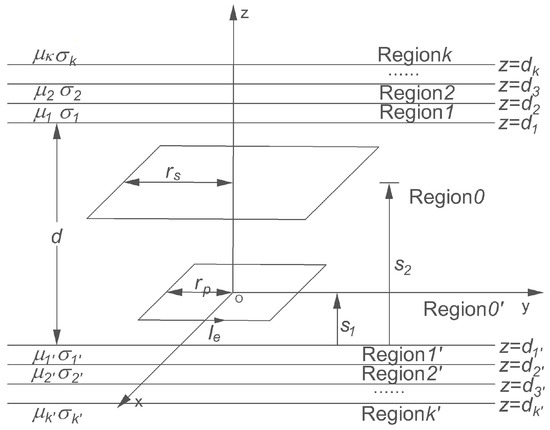 In the cylindrical coordinate shown in Figure 2, a k-layer medium is located at a coordinate d1 above the pick-up circular filament with radius of rs. The layers are numbered from 1 to k in an upward direction. Another k’-layer medium, of which layers are numbered from 1’ to k’ in a downward direction, is placed beneath the excited circular filament with radius of rp, which occupies the region z ≤ d1’. Each region of the multilayer medium has a thickness t k = | d k + 1 d k | except regions k and k’, which are considered semi-infinite. d is the distance between the upper surface of the multilayer media and the lower surface of the upper multilayer media. Each region is homogeneous and isotropic with an electrical conductivity σk and a relative permeability µk.