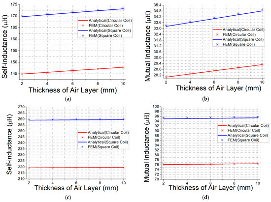 Figure 4. (a) Self-inductances with ferrite layer of μr = 30; (b) Mutual inductance with ferrite layer of μr = 30; (c) Self-inductances with ferrite layer of μr = 150; (d) Mutual inductance with ferrite layer of μr = 150.