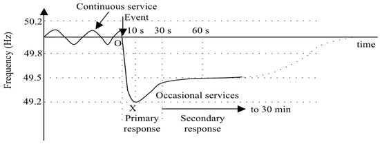 Normal standard requires the frequency excursion of ±0.2 Hz under regular operating states. This excursion could be raised to ±0.5 Hz if the total grid capacity is not high. If there is a large frequency disturbance, the power system requires a frequency control (primary and secondary) to correct the frequency disturbance [13,18]. Figure 2 describes the overall system frequency response with emphasizing on the effect of the total inertia of the power system in Great Britain [19]. It is clear that the frequency response passes through two main states. The first one is called primary response with a time frame range from 0 s to 30 s, which can be further split into two distinct zones that represent fast primary response from 0 s to 10 s and slow primary response from 10 s up to 30 s. The second one is called secondary response with a range of several up to thirty minutes. Other additional and slower frequency control (tertiary control is not shown in the figure.