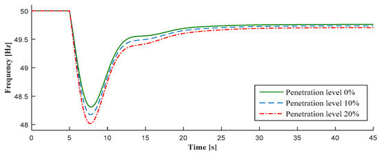 Generally speaking, the high penetration of wind power source in any electric grid results in frequency stability challenges, owing to the power electronics converter that decouples the wind turbine from the power system. Thus, the power system will be deprived from the inertia response that could be given by the VSWTs. In such cases, a control technique is needed to support and regulate the frequency [8]. Figure 3 shows the impact of increasing the penetration level of wind turbine in the electric grid. The figure reflects the need for proposing solution to alleviate the increase in the frequency deviation in the case of high wind penetration level.