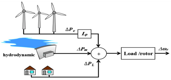 For the wind turbine model block, expresses the change in measured electrical power, and is the level of the penetration of the wind turbine generators. For the hydrodynamic model block, is the change in the mechanical power, is the rotor speed deviation and is the change in the load demand. For the rotor/load model block, Heq is system inertia constant and D is the load damping. It is worth mentioning here that the pitch control model is also included in the wind turbine model to secure both generator and turbine operations in above rated and under high wind speed conditions. Different gain values and limitations parameters for this model are found in [17]. Moreover, the following assumptions are considered:
