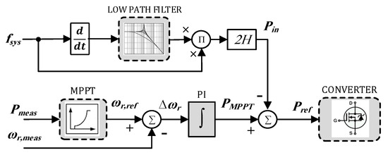 where H is inertia constant and is the frequency of the system (per unit). Figure 5 shows the diagram of releasing “hidden” emulation inertia controllers. A low pass filter is added in the feed forward path with the derivative term to avoid any frequency noisy measurement [19].