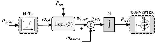 A normal maximum power point tracking (MPPT) block is also employed, which is only a static P-ω characteristic used to provide a reference speed for a definite power. The error signal between the measured and the reference speed is sent to a PI controller which is working in minimizing or attenuating this signal. The output control action from the PI controller represents the maximum power that should be followed by the converter in the normal condition and that is modified by Pin (Equation (3)) in the case of frequency event [11].
