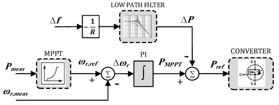 where fg is the real grid frequency, fm is the nominal reference frequency, Pg is the active power at fg, Pm is the active power at fm and R is the speed adjustment rate which also expresses the generator stiffness. A supplementary power signal will be generated as in Equation (8) and added to the power signal from MPPT controller, as shown in Figure 8. is the permanent droop.