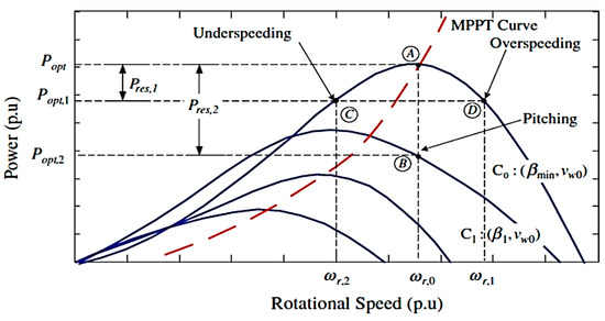 Another control method used for primary frequency support and principally differs than the concepts of releasing hidden inertia and droop control shown in Section 2 is known as de-loading control. The main idea of this method is to scarify the MPPT operation and keep the power available as reserves. In such case, the wind turbine will no longer work over the MPPT curve but it works on de-loading curve. Figure 9 shows three de-loading possibilities known as over-speeding, under-speeding and pitching, which can be applied in low and high wind speed, respectively.