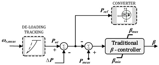 Generally, the pitch control is a common technique which is used to regulate (increase/ decrease) the output power of the wind turbine generator and keep minimum fatigue loads of the turbine. This control technique can contribute in supporting the frequency response and give adequate power reserve without spending on storage technology. This can be performed using the simple modification shown in Figure 11 where the required modified pitch angle no longer depends on a rotor speed input signal but instead relies on a power difference signal between the current measured value of the power and the de-loading power value. This signal constitutes the actuating signal for a proportional integral controller used in traditional pitch angle control to obtain the modified pitch angle. In such kind of control, a hierarchical control approach is needed to coordinate with droop controller and other control parameters for successful implementation [19,25].