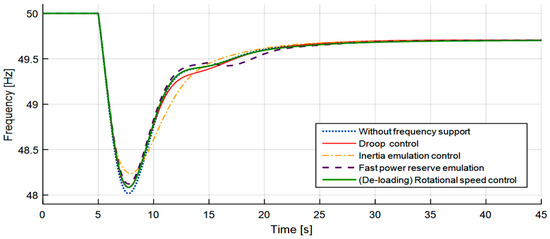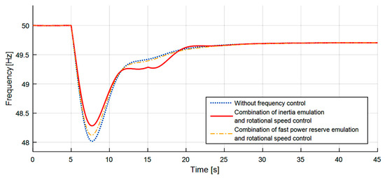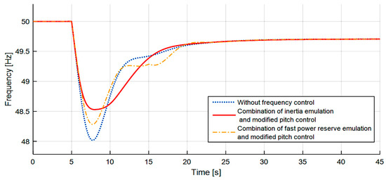 The importance of using control scheme for the frequency control problem under the proposed system configuration is completely reflected in Figure 12. If no control is applied, the ROCOF has high results in larger frequency excursion (in this case ∆f = 2 Hz) and lower FN (in this case TMF = 48 Hz). These values cannot be accepted in regards to grid codes in different areas [26,27,28] where the normal frequency deviation ranges ±0.02 Hz in Denmark, ±0.2 in Great Britain and ±0.5 Hz in Egypt. Hence, proposing control scheme can play a vital role in alleviating this problem. Figure 12 shows the frequency response for four different control schemes. The different controllers enhance the frequency response with respect to the case of no control. Among these controllers, the inertia emulation control gives the best response and enjoys smoother dynamic characteristics. It reduces the TMF value remarkably which leads to lowering the frequency deviation and enhance the FN (∆f = 1.75 Hz and TMF = 48.25 Hz). Furthermore, the frequency response with this controller enjoys smoother dynamic characteristics. On the other hand, during the period of increasing the frequency to new steady state frequency deviation (the right side of Figure 12), the ROCOF of the inertia emulation control is lower than the other controllers. Table 2 compares the dynamics of each controller under the low wind speed condition.