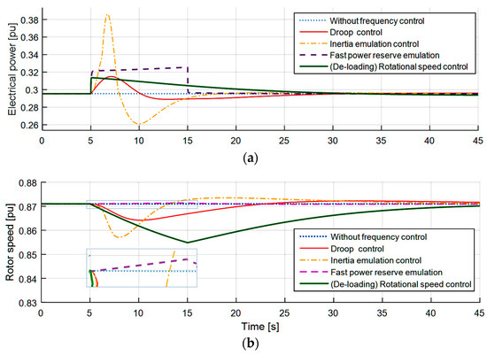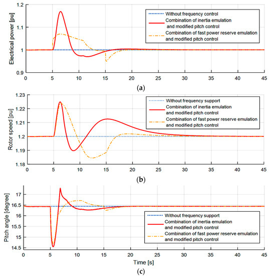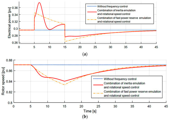 Figure 18a,b shows the response of electrical power and rotor speed for both combined controllers. The electrical power given by the wind turbine before and after the frequency event has no change in the case of no control. The instantaneous electrical power given by the wind turbine directly after the frequency event in the case of inertia emulation is higher than its corresponding value in the case of fast power reserve emulation. Despite the combination, the results here are in line with the results obtained with low speed and no combination. The instantaneous maximum percentage increase in the electrical power given by the wind turbine for inertia emulation and fast power reserve combinations with rotational speed control are approximately 7% and 2.5%, respectively.