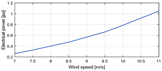 - Morren et al. [10] commented on the initial operating power of the turbine at the frequency disturbance event and the amount of available additional power in the turbine which is used to support the primary frequency response. In this paper, an investigation is performed to check the available additional power from the wind turbine in the case of higher wind speeds. This investigation is made for all four controllers. The wind speed range is chosen to be 7–11 m/s with an increment of 0.5 m/s, where the rated speed is set to be 11.34 m/s. For sake of brevity, only the results for inertia emulation control case—as a best control candidate in low wind speed—are presented. Figure 14 shows that the amount of contributed power by the wind turbine is increased as the wind speed increases due to higher stored kinetic energy.