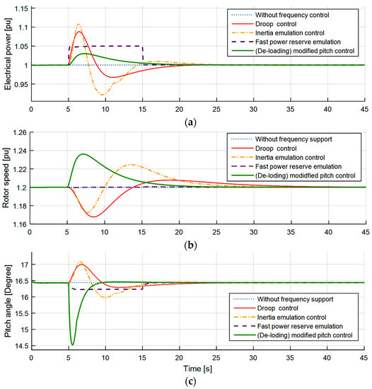 Figure 16a–c shows the response of the wind turbine electrical power, rotor speed and pitch angle for different primary frequency controllers after the suggested unbalance event. It is noticed that the electrical power for fast power reserve emulation remains constant for 10 s. The trend for the electrical power for other controllers is approximately the same, where an instantaneous increase in the value of the electrical power occurs and is associated with decrease in rotor speed directly after the frequency event. However, in this case, and due to the high value of the wind speed, the wind turbine rotor speed for the de-loading control (modified pitch control) is increased due to the reduction in the pitch angle value. The modified pitch angle controller shows a very high reduction rate for the pitch angle. This is followed by a decrease in the value of electrical power which is associated with an increase in the rotor speed except for the de-loading controller where the rotor speed starts to decrease. The instantaneous maximum percentage increase in the wind turbine electrical power of inertia emulation, fast power reserve, droop, and de-loading controllers are 11%, 5%, 8% and 2.5%, respectively, which enables the wind turbine—in high wind speed—to contribute in damping the grid frequency transient.