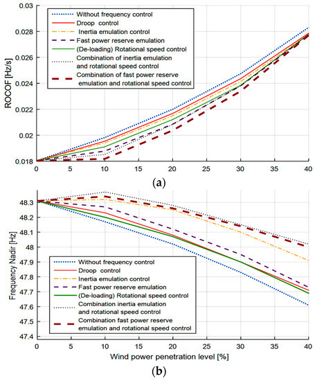 Figure 22 shows the ROCOF and FN with increasing wind power penetration level at high wind speed. Figure 22a reflects the following points: