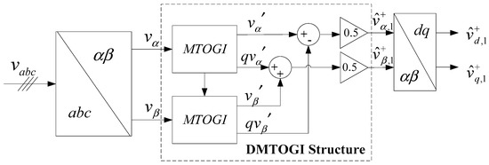 where vα, vβ are the voltage signal in αβ-frame after Clark transformation to the three-phase voltage vabc. and , which only contain voltage positive sequence component, are the output after vα′ and vβ′ undergoing the interleaved positive sequence components calculation. According to the complex vector filter Equations (4) and (11), the DMTOGI filter in the αβ frame (called αβDMTOGI) can be written as a complex vector transfer function