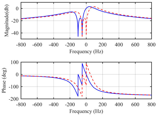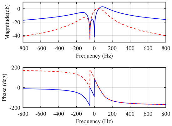 The frequency characteristics of αβDMTOGI(s) and the proposed dqDMTOGI(s) are shown in Figure 11. The red curve belongs to αβDMTOGI(s), whose notch frequencies are 0 Hz and −50 Hz. The blue curve belongs to dqDMTOGI(s), whose notch frequencies are −100 Hz z and −50 Hz. It can be observed that the characteristic curve of dqDMTOGI(s) is shifted left 50 Hz by corresponding to the characteristic curve of αβDMTOGI(s).