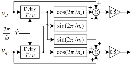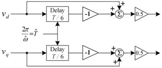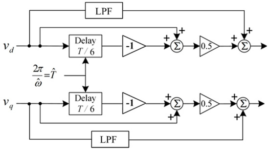 Table 1 summarizes the above conclusions and provides the dominant components of the grid voltage. As shown in Table 1, some frequency components are negative, which means that the voltage components of the grid are negative sequence voltage. It can be observed that the FFNS component and the DC offset component in the αβ-frame are voltage components at −50 Hz and 0 Hz, which are presented as voltage components at −100 Hz and −50 Hz in the dq-frame. Therefore, blocking FFNS, DC offset and all harmonic components in SRF-PLL inner loop means to eliminate voltage components at −50 Hz, −100 Hz, ±300 Hz, ±600 Hz, … in dq-frame.