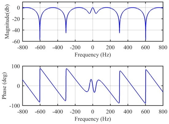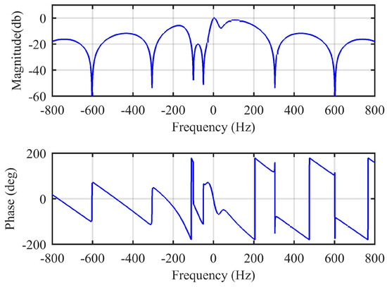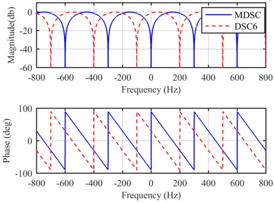 Figure 7 is the bode plot of the MDSC and DSC6. It can be observed that the frequency characteristic of the MDSC can be seen as the frequency characteristic of the DSC6 moving left 200 Hz on the frequency axis. As also can be seen in Figure 7, MDSC can completely block the harmonic components at ±300 Hz, ±600 Hz and other frequencies in the dq frame, but at the same time, the FFPS component at 0 Hz is also blocked.