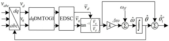 In addition, another problem in designing PLL is the existence of DC offsets in the input voltage which can cause fundamental frequency oscillation errors in the phase and frequency estimates of PLL [16,17,18,19,20]. In order to eliminate the phase and frequency estimation error caused by DC offset, reference [21] proposed a SO-SOGI-QSG filter consisting of two cascaded SOGI filter units, this method can completely remove the components of −50 Hz in the dq-frame and effectively eliminate the influence of DC offset. Reference [22] proposed a frequency-adaptive filtering MAF unit in stationary frame system to obtain and eliminate constant DC offset components. However, in reference [23], a modified MAF filtering unit was used to quickly eliminate constant and slow speed changing DC offset components within 1 ms. These methods can effectively eliminate the effects of DC offset, but increase the system response time and additional computational burden.