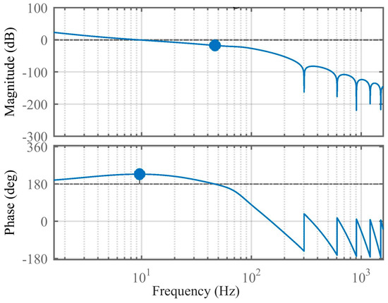 where is the estimated frequency of the grid and is 50 Hz. is the bandwidth adjustment coefficient, considering the low-pass filter response speed and bandwidth width, the value of is set to be 0.7. The bode plot of the EDSC is shown in Figure 9.