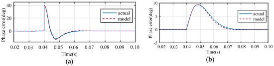To verify the accuracy of the small-signal model, this section verifies the small-signal model and the actual proposed PLL waveform by establishing a simulation comparison under MATLAB/Simulink. In the simulation, the phase error under phase jump of 10° and frequency jump of +1 Hz are compared respectively, as shown in Figure 15. It can be seen that the small-signal can describe the proposed PLL in this paper precisely.