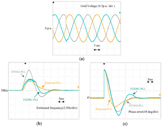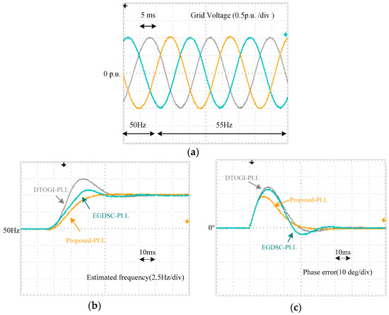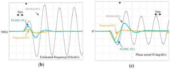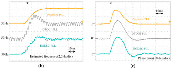 Figure 17 shows the experimental waveforms when the grid voltage undergoes a frequency step change of +5 Hz. It can be observed from Figure 17b, the proposed PLL achieves the accurate estimate of the grid frequency after approximately 1.5 cycles, whereas DTOGI-PLL and EGDSC-PLL take a longer time. There is frequency overshoot of +2.5 Hz and +0.5 Hz for DTOGI-PLL and EGDSC-PLL, respectively. However, the proposed PLL has no overshoot problem in frequency estimation. As can be seen in Figure 17c, the proposed PLL recovers the phase tracking of the grid after approximately 1.5 cycles, the response speed is faster than the other two PLLs.