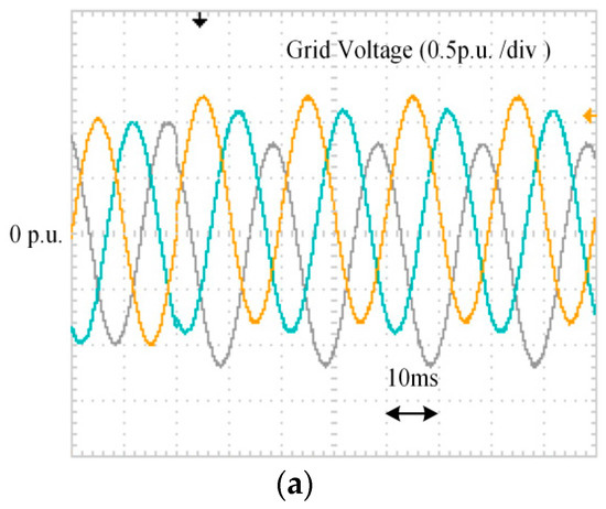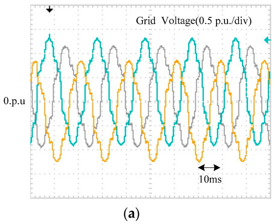 To evaluate the performance of the three PLLs when the grid voltage is distorted, the grid voltage distortion experiment is implemented. The injected harmonic voltage parameters are summarized in Table 3. In order to test the performance of the PLL when the grid frequency is changed, the frequency of the grid undergoes a +5 Hz frequency step change. Figure 19 shows the voltage waveform when the grid voltages are distorted.