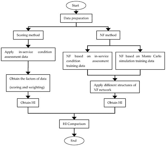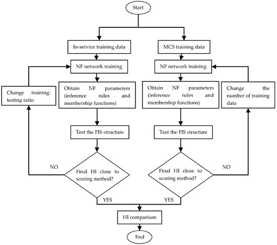 The flowchart for the training process of the NF network can be seen in Figure 3. The ratio of training and testing data was varied in order to optimize the NF network trained based on in-service condition assessment data. On the other hand, the NF network trained based on MCS data was optimized by varying the number of training data.