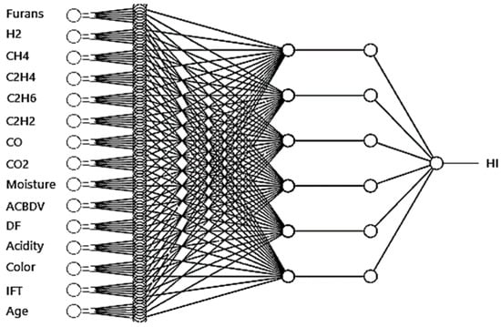 where is the output of second layer nodes, is the furans, is the H2, is the CH4, is the C2H4, is the C2H6, is the C2H2, is the CO, is the CO2, is the moisture, is the ACBDV, is the DF, is the acidity, is the IFT, is the color, and is the age. In the average nodes layer, the firing strength of the rules was normalized based on the ratio of each ith rules to the sum of all rules that can be obtained by Equation (5) [24].