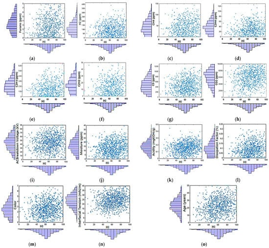 Simulated MCS data of (a) furans; (b) hydrogen (H2); (c) methane (CH4); (d) ethane (C2H4); (e) ethylene (C2H6); (f) acetylene (C2H2); (g) carbon monoxide (CO); (h) carbon dioxide (CO2); (i) ACBDV; (j) moisture; (k) acidity; (l) DF; (m) color; (n) IFT and (o) age versus HI.