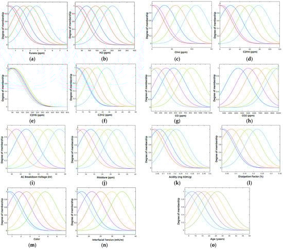 Membership functions of (a) furans; (b) H2; (c) CH4; (d) C2H4; (e) C2H6; (f) C2H2; (g) CO; (h) CO2; (i) ACBDV; (j) moisture; (k) acidity; (l) DF; (m) color; (n) IFT and (o) age for training based on MCS data.