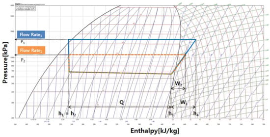 Figure 2 presents the p-h diagram with varying flow rates at the same indoor load in the target building. The system COP can be obtained using the values at each point of the heat pump cycle shown in Figure 2, as shown in Equation (17): [21]