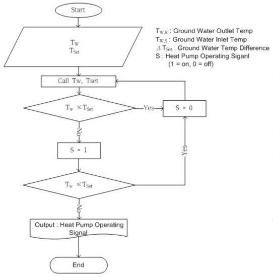 In general, when a heat pump, which is responsible for only a part of the load of the entire building, is operated, the efficiency of the entire system is reduced when a constant-speed pump is used. A constant water flow rate control method was the existing operation method of the target building and this method was to supply a constant water flow rate. According to the set cold and hot water temperatures, the system is operated if the upper limit of the set temperature is reached, and the operation of the heat pump is stopped if the temperatures of the cold and hot water outlets reach the set lower limit. Figure 3 shows the existing constant water flow rate control algorithm.