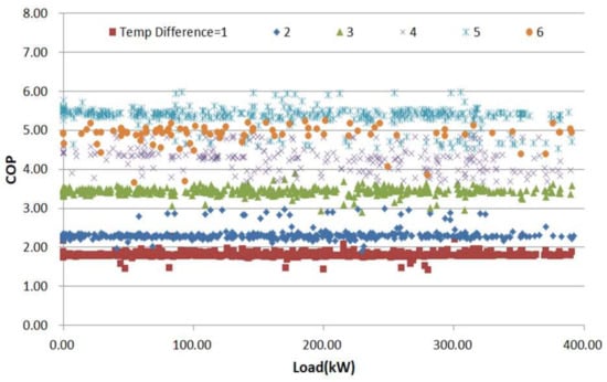 Relationship of temperature difference and geothermal heat pump system COP according to the load.