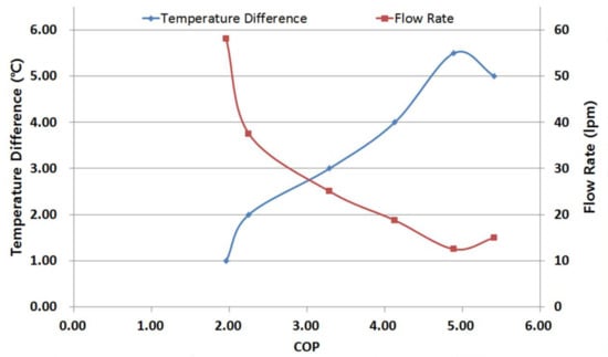 Figure 5 presents the results of COP analysis according to the temperature difference and flow rate. At a lower flow rate and higher temperature difference, the COP showed an improvement of the COP; the highest COP was observed when the flow rate was 13 LPM and the difference in temperature was approximately 5 °C. If the flow rate decreases since then it is likely that the COP shows a decrease. The COP improvement effects of the geothermal heat pump systems can be verified by controlling the variable flow rate between the designed maximum flow rates and the smallest flow rate to the maximum COP.