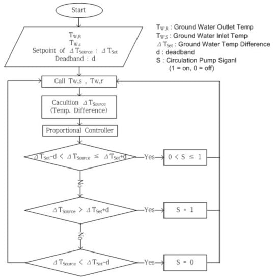 As shown in Figure 7, after calculating the temperature difference between the inlet and outlet by measuring the geothermal water temperature of the inlet and outlet of the geothermal heat pump, the calculated temperature difference was compared with the set temperature difference, and the system was controlled proportionally to reach the set temperature difference. Several cases are considered: