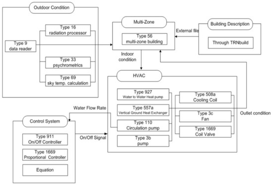 Figure 9 shows the simulation flow diagram of the operating number control according to the set temperature, which is the existing operation method of the target building. The water-to-water type heat pump Type 927 was used for the heat pump and the vertical heat exchanger Type 557a was used for the underground heat exchanger. Type 3b was used for the underground circulation pump and cold water supply pump. To control the set temperature of each geothermal heat pump, the set temperature of the heat pump was used as the controller input value and the on/off controller Type 911 was used.