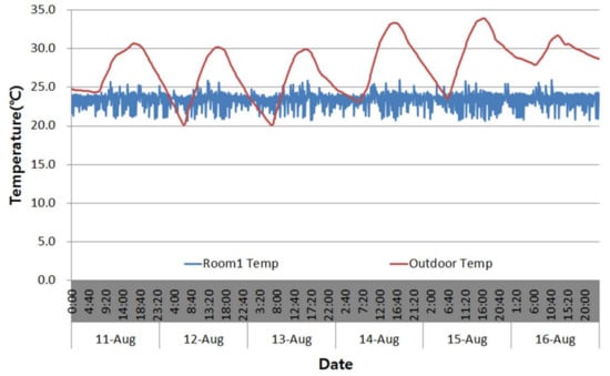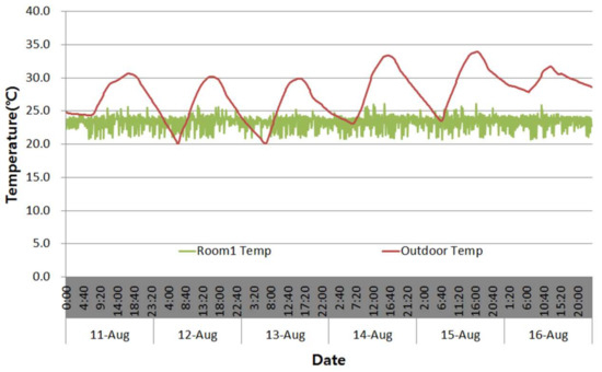 The indoor thermal environment when the geothermal water flow rate control of the geothermal heat pump system was applied was analyzed. Figure 11 and Figure 12 show the changes in the indoor temperature according to the CASE. The room temperature was set to 24 °C (±0.5 °C), which the temperature was maintained within the set temperature variation in CASE 1, which was the existing method, and CASE 2, where geothermal water flow rate control was applied.