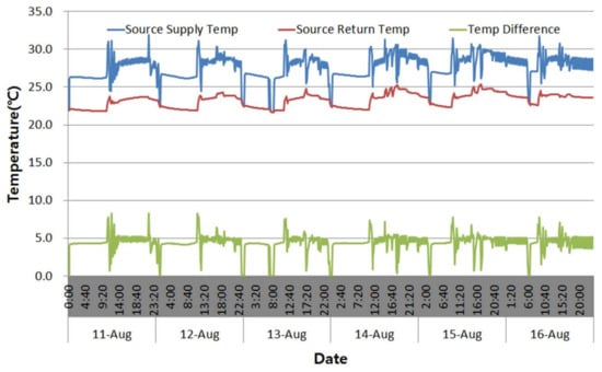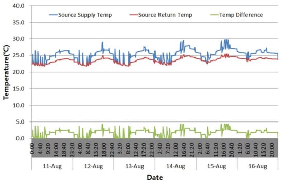 To analyze the geothermal water temperatures of the inlet and outlet of the geothermal heat pump, Figure 13 and Figure 14 present the changes in the geothermal water temperatures of the inlet and outlet. In CASE 1, the average temperature difference was approximately 1.7 °C. In CASE 2, because the flow rate was controlled by adjusting the geothermal water temperature difference so that it would be 5 °C (±0.5 °C), an average of approximately 4.3 °C was relatively stable.