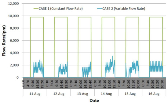 Load calculations from constant flow rate control and variable flow rate control can be expressed as Equation (20); therefore, the flow rates from variable control may be written as Equation (21):