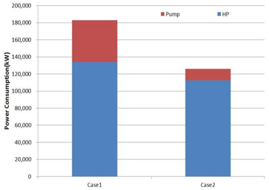 Figure 15 shows the geothermal water flow rate for each case. The flow rate in the variable flow rate control method is approximately 70% lower than the constant water flow rate method. Figure 16 shows the heat pump and circulation pump energy consumption for each case to analyze the energy consumption when applying the geothermal water flow rate control method of the geothermal heat pump. The total energy consumption was 182,936 kW for CASE 1, in which the constant flow rate control method of the target building was used, and 125,919 kW for CASE 2, in which the geothermal circulation water flow control method was applied. The energy consumption of CASE 2 was 32% lower than CASE 1, and the energy consumption of the circulation pump is approximately 70% lower. Table 7 lists detailed energy consumption values of the heat pump and circulation pump for each case.