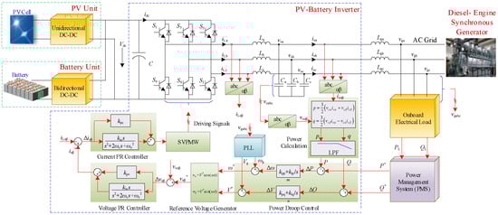 Onboard AC electrical power system may be categorized as an islanded AC microgrid [7], which causes numerous power quality issues. One prominent problem is the voltage/frequency swing during the start-up and braking of sailing caused by the substantial rapid load of high-power propulsion changing, which will increase power losses and reduce SPS stability, reliability, and security [8,9]. Chinese SPS standards stipulate that the vessel’s grid voltage and frequency variation range must be −10~+6% and −5~+5% respectively [10]. Meanwhile, presently there is extensive use of emerging diode rectifiers, pulsed power-electronics loads, non-linear loads, and asymmetrical loads in the SPSs, which arouse a series of power quality issues of harmonics, unbalanced voltage, as well as dc-offset voltage from scaling errors in the grid voltage measurement of grid current performance [11,12]. When the PV generation technique is applied on a ship for the shipboard PV–diesel-battery hybrid AC power system, a PV inverter is essential to convert PV battery direct currents into alternating currents that are synchronous to the grid. However, as the power capacity of a PV inverter is much lower than that of a diesel-engine synchronous generator for laying area limitations, the PV inverter has less grid-voltage regulation capability and is suitable for the current injection method by means of a diesel-engine synchronous generator working in standalone mode as a slack bus. Hence, how the vessel’s fundamental frequency sequence voltage can be quickly and accurately tracked under such adverse grid conditions has become a critical concern with respect to shipboard PV–diesel-battery hybrid power systems.