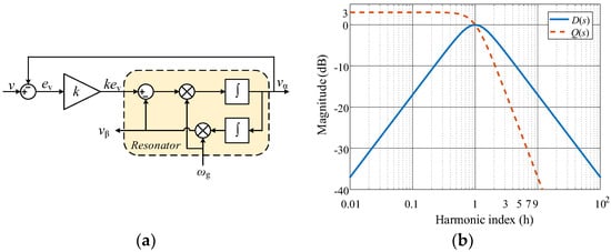 Figure 2a depicts the block diagram of a SOGI structure. The SOGI is a frequency-adjustable resonator that is damped by an output loop. This outer loop introduces the error ev between the resonator output vα and the input signal v in the resonator input through gain k.