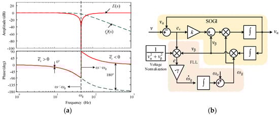 The Q(s) and E(s) bode magnitude-phase plots and a SOGI-based frequency-locked loop (SOGI-FLL) schematic: (a) Bode plots of Q(s) and E(s); (b) SOGI-FLL schematic.