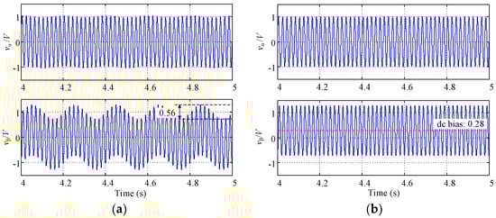 Time response of the SOGI vα/V and vβ/V for an input signal including a subharmonic and a dc-bias respectively in k = 1.414: (a) time response for the subharmonic of 5 Hz/0.2 V amplitude transmitting; (b) time response for 0.2 V dc bias transmitting.