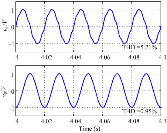 The presence of low-order harmonics in the input signal has a direct impact on the SOGI in-phase output since this output behaves as a bandpass filter (BPF) with −20 decibels per decade slope at frequencies greater than the oscillation frequency (see Figure 2b). This attenuation rate obtains a better filtering performance for switching harmonics but is not sufficient for low-order harmonics. To evaluate this problem, Figure 6 shows the SOGI in-phase response to 5th and 7th harmonics that are both at 15% of the fundamental voltage. The 5th and 7th harmonics were partly translated to the output vα and aroused a higher (5.21%) total harmonics distortion (THD). When SOGI was directly used in the proposed SPS shown in Figure 1, the in-phase output signals with low-frequency harmonics could be directly delivered to the grid through the PV–battery inverter making grid-injected current distortion, which then decreased the power qualities. Hence, a sharp slope of attenuation to harmonics is necessary to deal with the low-order harmonics existing in SPS.