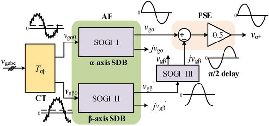 where vgabc+, vgabc−, and vgabc0 represent its positive sequence, negative sequence, and zero sequence components, respectively. Accurate grid voltage information cannot be obtained by SOGI on unbalanced voltage due to the unequal three-phase voltage amplitude. Hence, for SPS application, a positive sequence extractor (PSE) unit should be included at the front of the SOGI.
