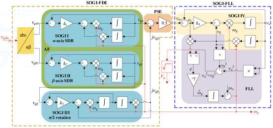 The proposed SOGI-FDE and SOGI-FLL based SOGI-FDE-FLL schematic.