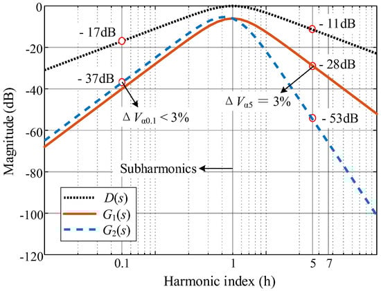 Figure 9 depicts the D(s), G1(s), and G2(s) magnitude plot in LF harmonics with the same damping constants of k = 1.414 and oscillation frequency of ωg = 314 rad/s. All of these have the capability of dc bias attenuation. D(s) represents the 1st-order SOGI of in-phase output with a narrow BPF, but insufficient LF harmonics suppression at 20 dB per decade slope. G1(s) was obtained by the 2nd-order SOGI, where the LF harmonics obtain substantial attenuation at 40 dB per decade slope for an s-domain of 2 zeros and 2 pairs of left-half poles. The 5th harmonic was reduced to 3%, and 0.1-order subharmonics can be degraded to lower than 3% (see Figure 9 for illustration). G2(s) was composed of the 3rd-order SOGI with the same G1(s) in the subharmonic zone and a sharp attenuation to the low-order harmonics at 80 dB per decade slope decrease. Hence, besides the positive sequence extractor from the unbalanced voltage, this proposed schematic has good features of LF harmonics, sharply fading out, including subharmonics and low-order harmonics without a dc bias, which allows this schematic to overcome the limitations of the SOGI’s limitations -mentioned in Section 3.3.
